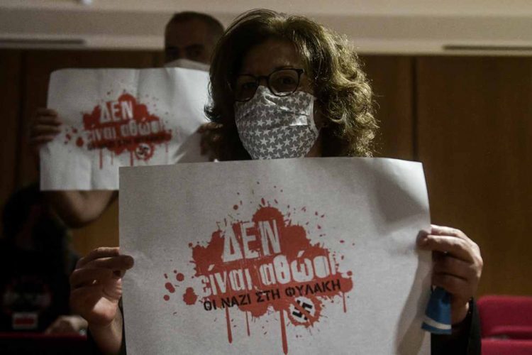▸Η δυναμική αντιφασιστική παρέμβαση έξω από το Εφετείο, αλλά και μέσα στην αίθουσα, σφράγισε την επανέναρξη την Τετάρτη της δίκης της Χρυσής Αυγής, ύστερα από τρείς μήνες διακοπής ελέω πανδημίας. Η δίκη ξεκίνησε ξανά με τις αγορεύσεις των δικηγόρων υπεράσπισης. Μέλη αριστερών, αντιρατσιστικών και αντιφασιστικών οργανώσεων, με τη συμμετοχή και της Μάγδας Φύσσα, σήκωσαν μέσα στην αίθουσα χαρτιά διαμαρτυρίας που έγραφαν «Δεν είναι αθώοι, οι ναζί στη φυλακή» με μία σβάστικα διεγραμμένη. H αντιφασιστική καμπάνια έχει στόχο να ασκήσει την μέγιστη δυνατή πίεση για πλήρη ανατροπή της ουσιαστικά απαλλακτικής εισαγγελικής πρότασης και την βαριά καταδίκη όλων των κατηγορουμένων χρυσαυγιτών, νυν και πρώην. Κεντρικό αίτημα της πολιτικής αγωγής πλέον είναι να μην υπάρξουν άλλες αδικαιολόγητες καθυστερήσεις.