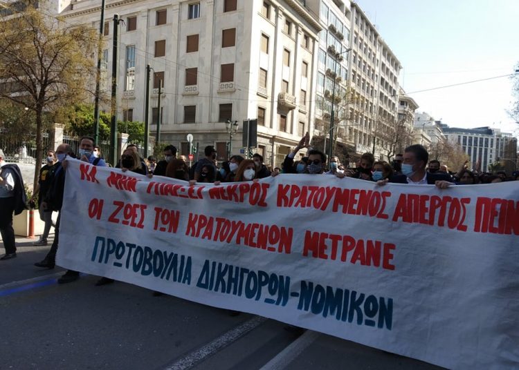 Πολύ μεγάλη συγκέντρωση πραγματοποιήθηκε το μεσημέρι του Σαββάτου στο Σύνταγμα, ενώ ακολούθησε και διαδήλωση με τη συμμετοχή χιλιάδων πολιτών, μετά από κάλεσμα οργανώσεων της μαχόμενης και αντικαπιταλιστικής Αριστεράς, της Πρωτοβουλίας Δικηγόρων-Νομικών και άλλων συλλογικοτήτων, καθώς και φοιτητικών συλλόγων για το δίκαιο αίτημα του φυλακισμένου απεργού πείνας, Δημήτρη Κουφοντίνα να μεταφερθεί στις φυλακές Κορυδαλλού.