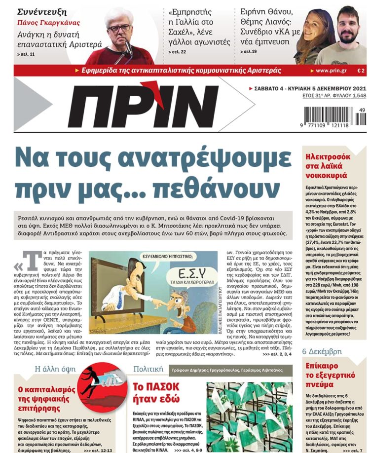 ▸Ρεσιτάλ κυνισμού και απανθρωπιάς από την κυβέρνηση, ενώ οι θάνατοι από covid-19 βρίσκονται στα ύψη. Εκτός ΜΕΘ πολλοί διασωληνωμένοι κι ο Κ. Μητσοτάκης λέει προκλητικά πως δεν υπάρχει διαφορά! Αντιδραστικό χαράτσι στους ανεμβολίαστους άνω των 60 ετών, βαρύ πλήγμα στους φτωχούς