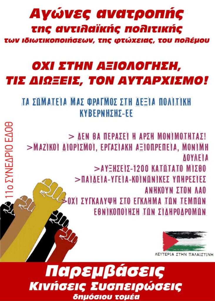 Οι Παρεμβάσεις ήμασταν η μόνη δύναμη που με προτάσεις και τοποθετήσεις προσπαθήσαμε το 11ο Συνέδριο της ΕΔΟΘ να διεξαχθεί με τήρηση δημοκρατικών διαδικασιών, ουσιαστικής συζήτησης και συμβολής να ανταποκριθεί στις αγωνίες και τις ανάγκες των εργαζομένων. Καταθέσαμε εφ’ όλης της ύλης προτάσεις για τις διαδικασίες, τα αιτήματα και τις διεκδικήσεις που να απαντούν και να αποδομούν το μπαράζ αντιλαϊκών και αυταρχικών μέτρων της κυβέρνησης (αξιολόγηση, απολύσεις, πειθαρχικά, άρση της μονιμότητας, μισθούς, ΣΣΕ, πρωτογενή πλεονάσματα, οικονομία πολέμου, κ.ά.). Καταθέσαμε σχέδιο ανυποχώρητου αγώνα στην προοπτική νίκης με μορφές πάλης σύγκρουσης και ανατροπής της δολοφονικής πολιτικής και της ίδιας της κυβέρνησης!