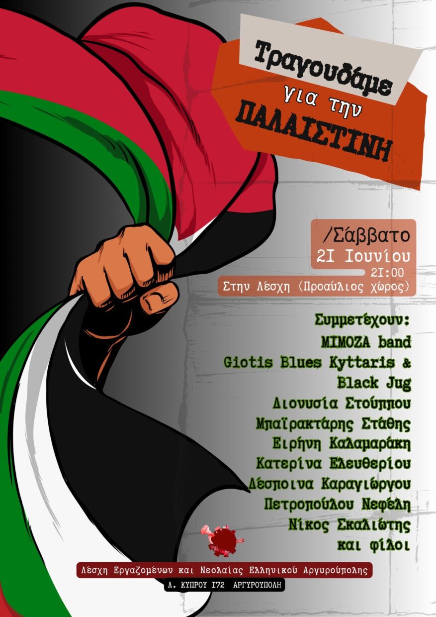 ▸Συναυλία αλληλεγγύης με τίτλο «Φωνή για την Παλαιστίνη» διοργανώνει η Λέσχη Εργαζομένων και Νεολαίας Ελληνικού-Αργυρούπολης το Σάββατο 21/6 στις 9 μ.μ. στον προαύλιο χώρο της (Κύπρου 172, Αργυρούπολη).