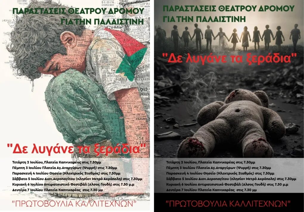 Η Πρωτοβουλία Καλλιτεχνών Για Την Παλαιστίνη στέκεται απέναντι στη βαρβαρότητα του πολέμου και γίνεται φωνή για όσους σιωπούν, μέσα από την παράσταση «Δε Λυγάνε τα Ξεράδια», που θα παιχτεί σε πλατείες και δρόμους της πόλης.
