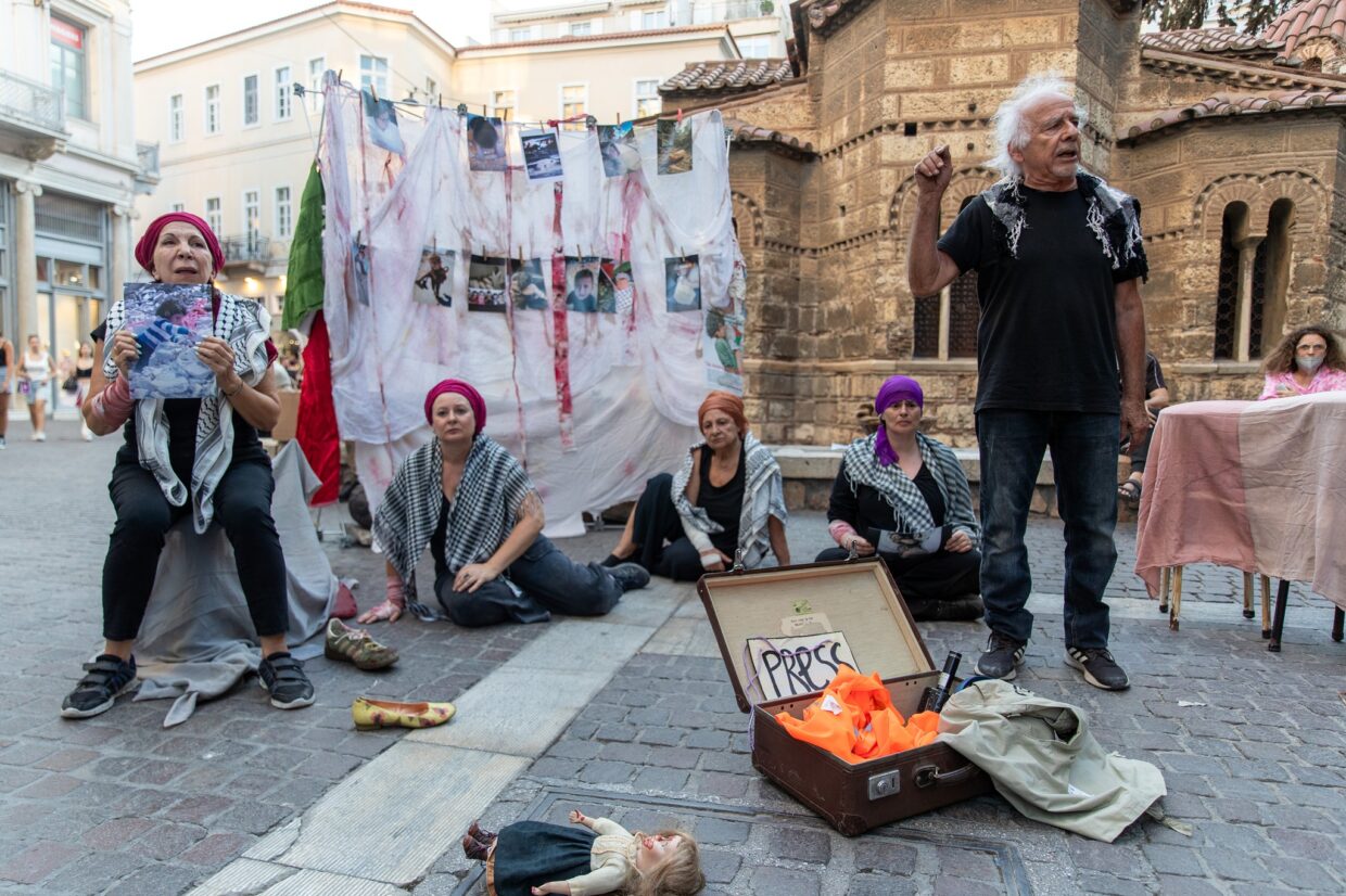 Με θέατρο δρόμου, καλλιτεχνικά βίντεο και παρεμβάσεις η Πρωτοβουλία Καλλιτεχνών για την Παλαιστίνη έφερε το καυτό θέμα της γενοκτονίας μέσα στην καθημερινή κίνηση στο κέντρο. Το Πριν παρακολούθησε την τελευταία παράσταση από το έργο Δε λυγάνε τα ξεράδια.