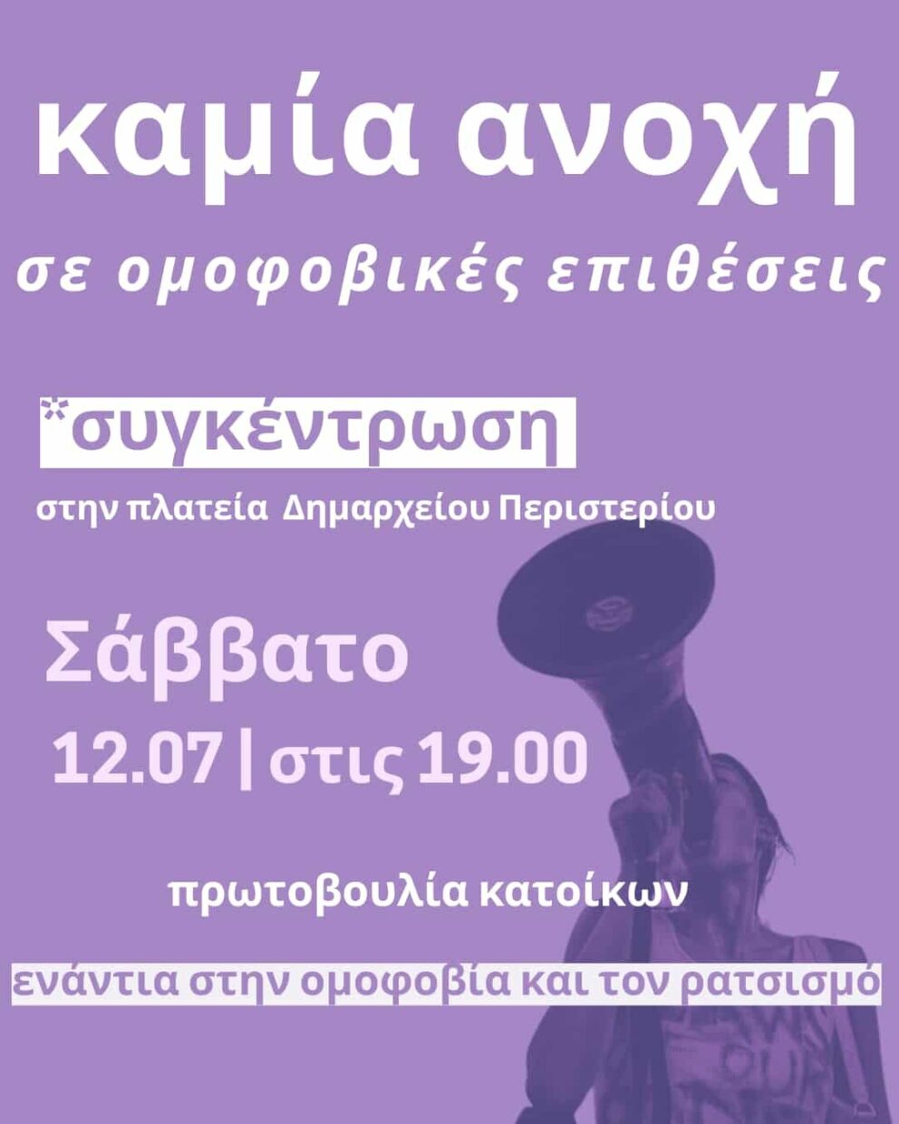 Σάββατο 12 Ιουλίου, 19.00, συγκέντρωση στην πλατεία Δημαρχείου Περιστερίου