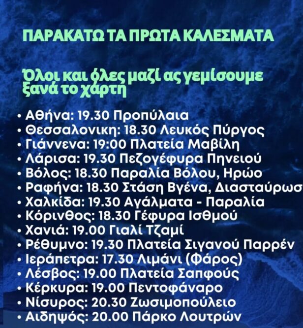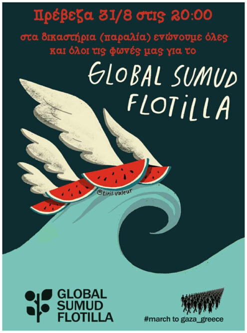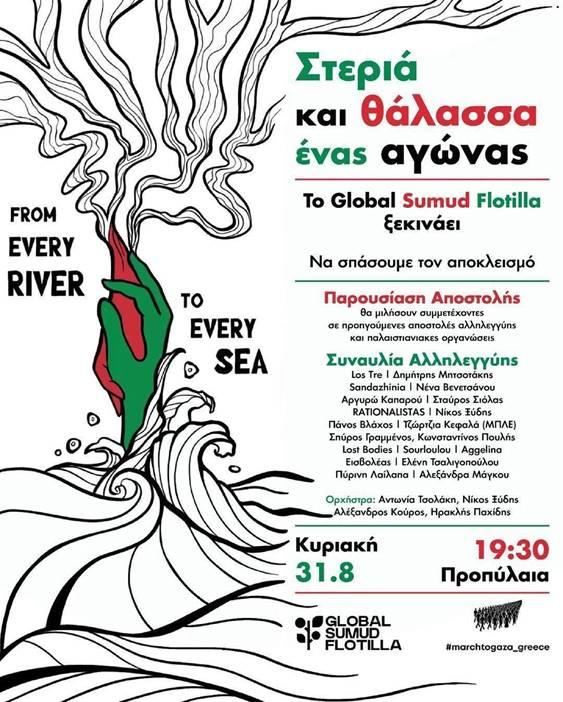 Στο πλαίσιο του παγκόσμιου καλέσματος για δράσεις στήριξης και ορατότητας του στόλου Global Sumud Flotilla θα πραγματοποιηθούν εκδηλώσεις αλληλεγγύης σε όλη τη χώρα και στην κεντρική συγκέντρωση στα Προπύλαια στις 19:30 για την εκδήλωση παρουσίασης του εγχειρήματος και τη μεγάλη συναυλία αλληλεγγύης.