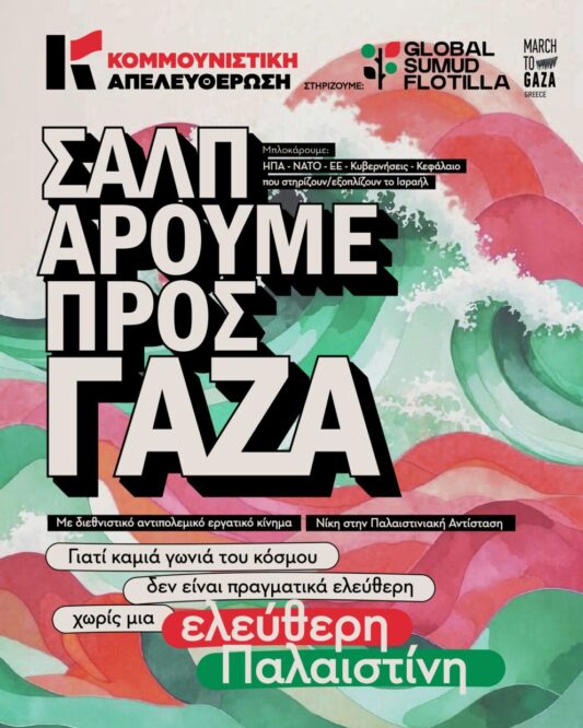 Οι οργανώσεις Κομμουνιστική Απελευθέρωση και νεολαία Κομμουνιστική Απελευθέρωση χαιρετίζουν την πρωτοβουλία Global Sumud Flotilla για έναν διεθνή στόλο που θα επιχειρήσει να σπάσει τον ναυτικό αποκλεισμό της Λωρίδας της Γάζας μεταφέροντας ανθρωπιστική βοήθεια και μήνυμα αλληλεγγύης στην παλαιστινιακή αντίσταση κατά του πολέμου και της κατοχής.
