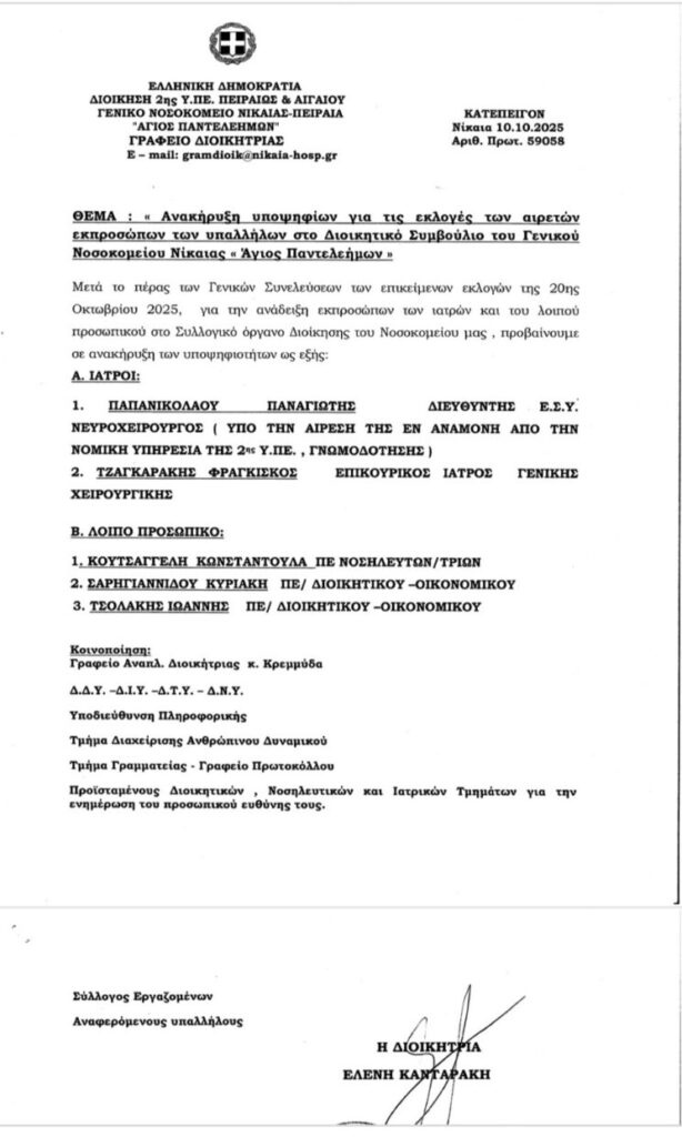 Στις 14/10/25 η διοικήτρια με νέο έγγραφό της ΑΝΑΙΡΕΙ ΤΟ ΠΡΟΗΓΟΥΜΕΝΟ ( ! ) και εκ των υστέρων ΑΠΟΡΡΙΠΤΕΙ την υποψηφιότητα Παπανικολάου (του πολλές φορές επί 20 χρόνια εκλεγόμενου ΠΟΥ ΔΕΝ ΣΥΝΑΙΝΕΙ ΣΤΗΝ ΕΚΝΟΜΗ ΧΥΔΙΑΙΟΤΗΤΑ ΔΙΑΓΡΑΦΗΣ των συναδέλφων των προερχόμενων από το πρώην Δ. Αττικής) «διορίζοντας» πραξικοπηματικά και χωρίς εκλογική διαδικασία τον άλλο υποψήφιο («εκλεκτό» της διοικήτριας και στέλεχος της ΔΑΚΕ που προφανώς συναινεί στην διαγραφή των συναδέλφων) ως δήθεν … «εκπρόσωπο» των γιατρών του νοσοκομείου.