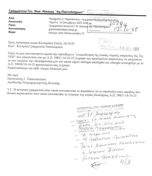 Ταυτόχρονα 16/10/25 ο Παπανικολάου με νέο έγγραφό του απαιτεί να μάθει τους λόγους που εκ των υστέρων στις 14/10/25 η διοικήτρια απέρριψε την υποψηφιότητά του την οποία η διοικήτρια την είχε κάνει δεκτή και την είχε ανακηρύξει στις 10/10/25 αποδεχόμενη έτσι στην πράξη στις 10/10/25 την απαίτηση Παπανικολάου να διορθωθούν οι εκλογικοί κατάλογοι (δηλαδή τα μητρώα εργαζομένων του νοσοκομείου) με την επαναφορά εκεί των γιατρών και λοιπών εργαζόμενων με οργανική θέση στο Δ. Αττικής που παρανόμως, αιφνιδιαστικά και αυθαίρετα η διοικήτρια είχε διαγράψει.