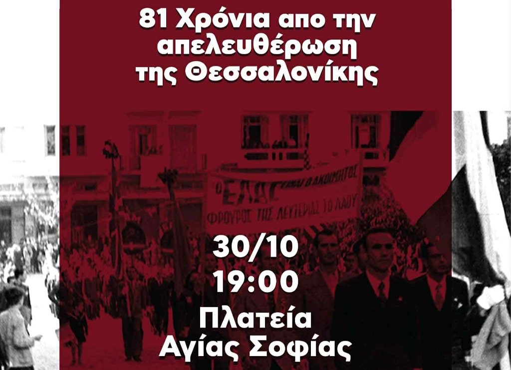 Την Πέμπτη 30 Οκτώβρη συμπληρώνονται 81 χρόνια από τη μέρα που οι δυνάμεις του ΕΛΑΣ μπήκαν στη Θεσσαλονίκη και απελευθέρωσαν την πόλη από τη ναζιστική κατοχή των Γερμανών και των ντόπιων συνεργατών τους. Η Κομμουνιστική Απελευθέρωση και η νεολαία Κομμουνιστική Απελευθέρωση καλούν την ίδια μέρα στις 7 μ.μ. σε συγκέντρωση την πλατεία Αγίας Σοφίας, στον ίδιο τόπο που ο λαός της πόλης πανηγύρισε την απελευθέρωση το 1944.