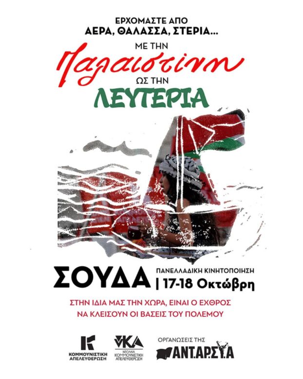 Στο κέντρο του ελληνικού κινήματος αλληλεγγύης στην αντίσταση του παλαιστινιακού λαού δεν μπορεί παρά να βρίσκεται η πάλη ενάντια στην ελληνική εμπλοκή στη γενοκτονία. Στο πλαίσιο των δράσεων αλληλεγγύης οργανώνεται διαδήλωση στην αμερικανική βάση στη Σούδα στις 17 και 18 Οκτωβρίου από το March to Gaza με τη στήριξη φορέων και συλλογικοτήτων της Κρήτης. Η βάση της Σούδας είναι η σημαντικότερη στρατιωτική υποδομή των ΗΠΑ και του ΝΑΤΟ στη νευραλγική περιοχή της Ανατολικής Μεσογείου καθώς εποπτεύει, συντονίζει και διευκολύνει στρατιωτικές επιχειρήσεις σε Βαλκάνια, Μέση Ανατολή, Μεσόγειο και Βόρεια Αφρική. Η Σούδα έχει παίξει καθοριστικό ρόλο σε πολέμους του παρελθόντος (π.χ. Ιράκ 1991, Αφγανιστάν 2003 κ.α.) ενώ σήμερα στηρίζει αποφασιστικά το Ισραήλ στον πόλεμο που διεξάγει.