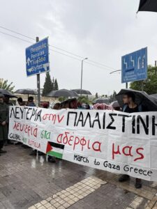 Σήμερα το πρωί πραγματοποιήθηκε παράσταση διαμαρτυρίας στο ΥΠΕΞ από αντιπροσωπεία του March to Gaza και αλληλέγγυο κόσμο, παρά την καταρρακτώδη βροχή. Όπως καταγγέλει το March to Gaza: