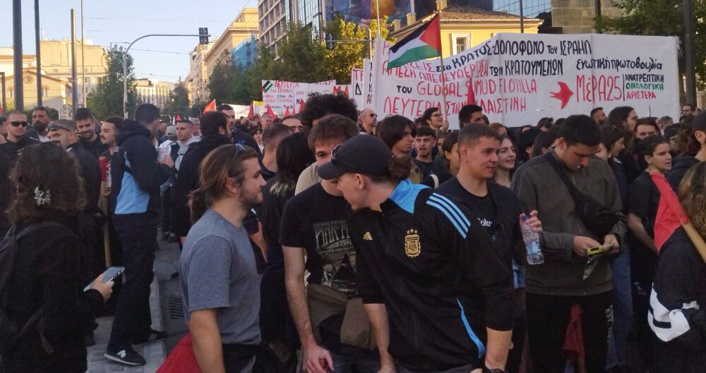 Δυναμική συγκέντρωση και πορεία από τα Προπύλαια προς το Σύνταγμα πραγματοποιήθηκε το απόγευμα της Κυριακής (4/10) σε ένδειξη αλληλεγγύης στους 27 Έλληνες κρατούμενους της αποστολής Global Sumud Flotilla (GSF). Όπως ανακοινώθηκε οι Έλληνες απαχθέντες θα επιστρέψουν αύριο στην Ελλάδα από το Ισραήλ με ειδική πτήση.