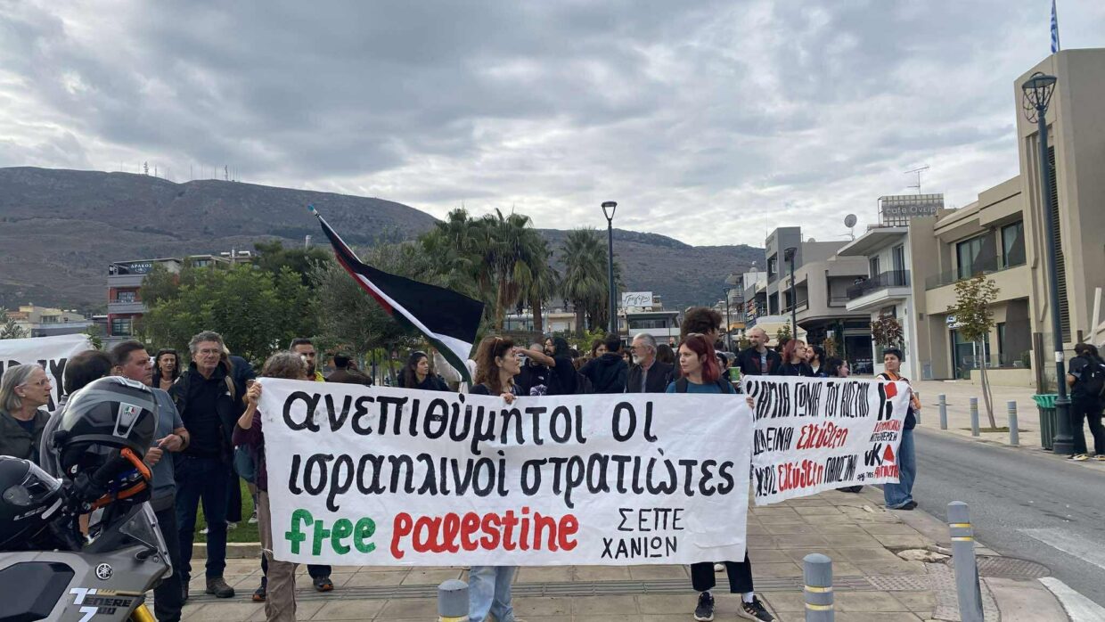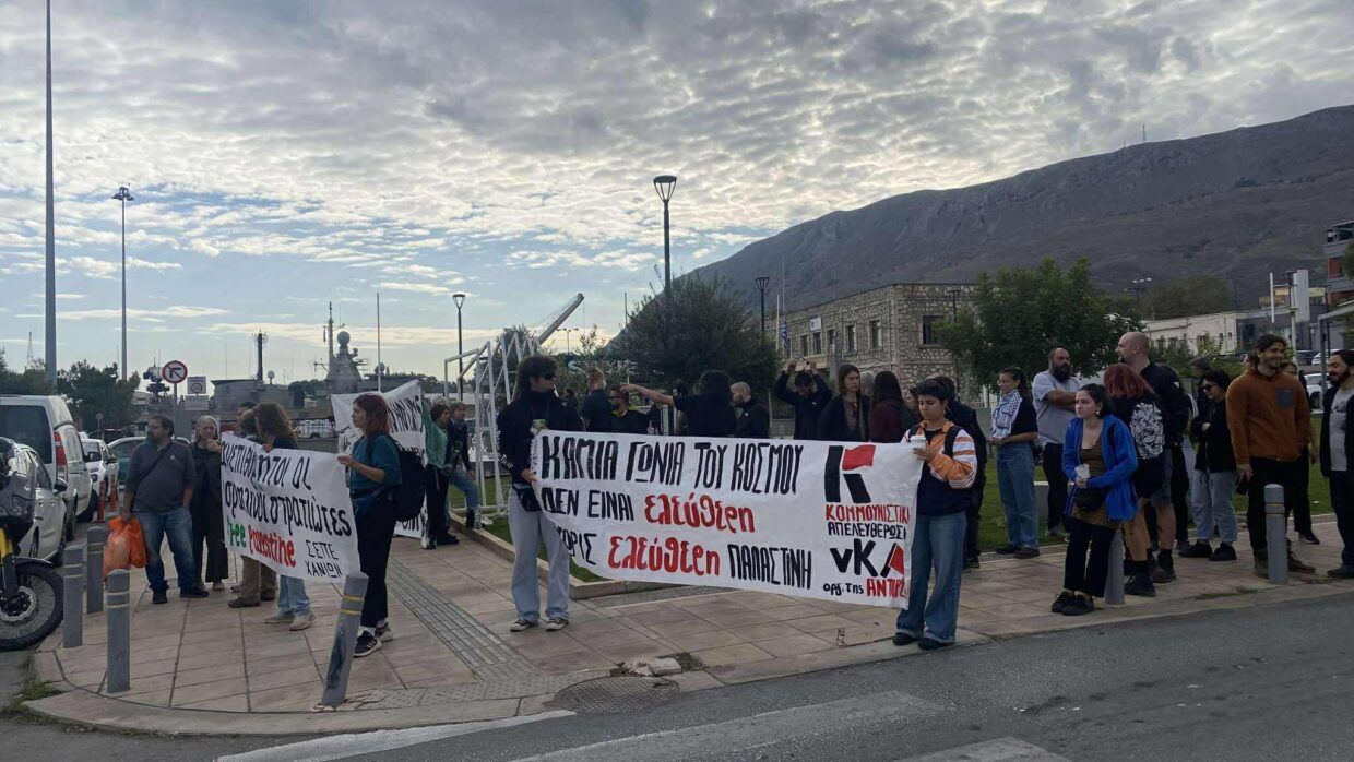 «Η κυβέρνηση από την άλλη, απέδειξε ξανά πως είναι δεμένη στο άρμα του πολέμου. Είναι «αγκαλιά» με τους δολοφόνους και τον καταζητούμενο για εγκλήματα κατά της ανθρωπότητας Μπ. Νετανιάχου. Αλλωστε, η ίδια η Κρήτη έχει μετατραπεί σε ορμητηριο των νατοϊκών φονιαδων που ξαναχαραζουν σύνορα με το αίμα των λαών! Σήμερα λοιπόν επιστρατεύτηκαν εκ νέου τα ΜΑΤ για να περιφρουρήσουν τις διακοπές των Ισραηλινών τουριστών, οι οποίοι για άλλη μια φορά φώναζαν ρατσιστικά συνθήματα και έβριζαν τους συγκεντρωμένους. Τ