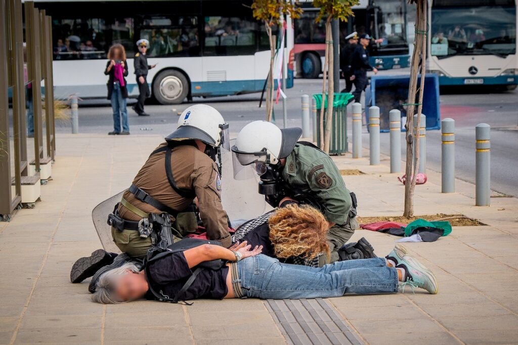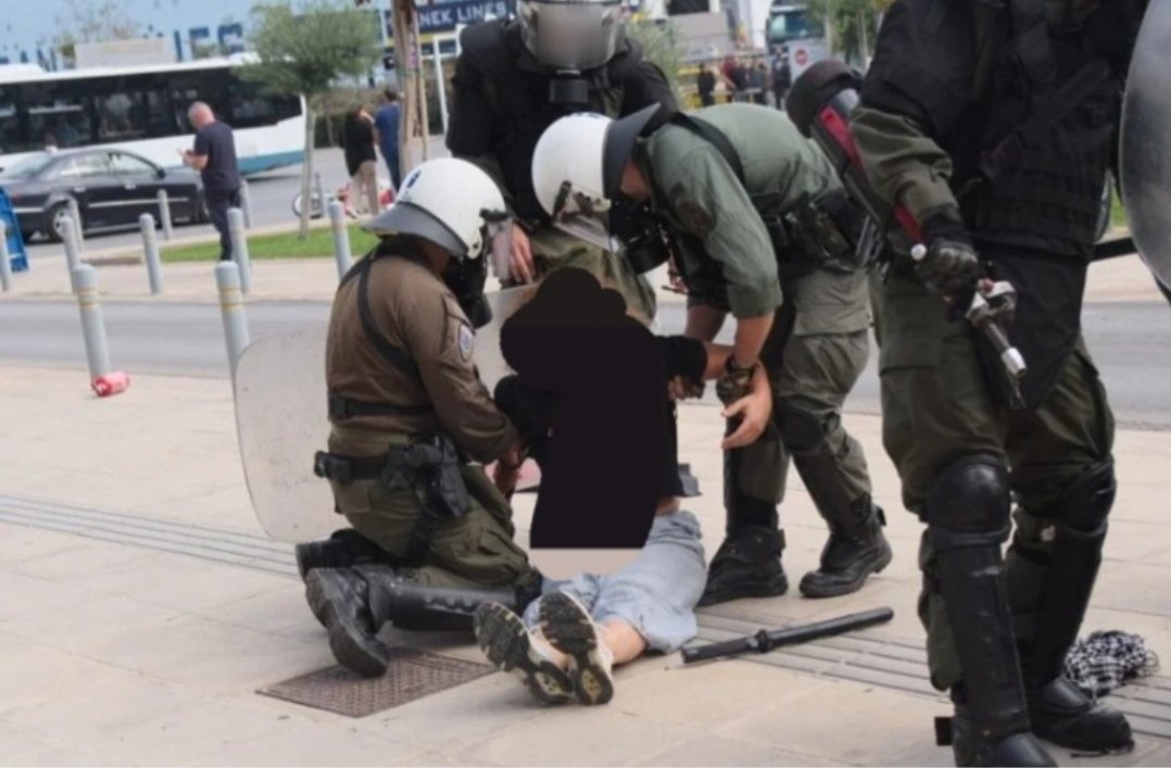 Εδώ τα γενναία ΜΑΤ στα Χανιά της Κρήτης ψεκάζουν εξ επαφής κοπέλες και μπουζουριάζουν επικίνδυνες τρομοκράτισσες με σημαίες της Παλαιστίνης που διαμαρτύρονταν για την άφιξη του Crown Iris στην πόλη. pic.twitter.com/WRZfITRUf4