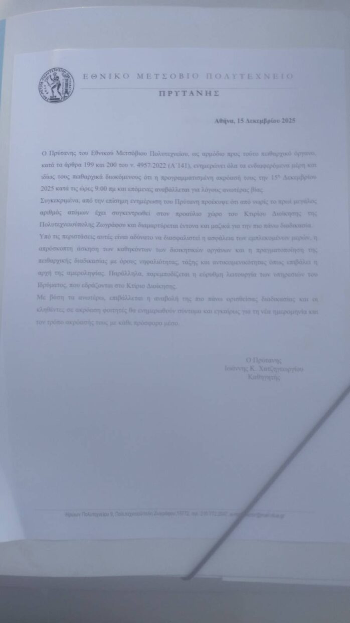 Η πρυτανεία κοινοποίησε έγγραφό της με το οποίο αναβάλει τη διαδικασία για άγνωστο χρόνο (σχετική φωτογραφία).