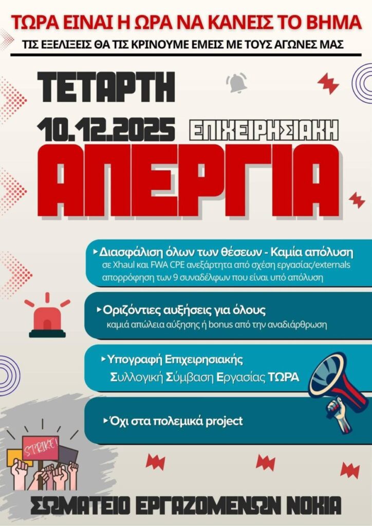 Στηρίζουμε ολόψυχα την απόφαση των συναδέλφων μας στην Nokia για επιχειρησιακή απεργία την Τετάρτη 10 Δεκεμβρίου. Παράλληλα, στηρίζουμε τα αιτήματα των συναδέλφων μας στην Nokia για: