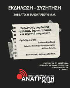 Η εκδήλωση εντάσσεται στην εξόρμηση της Πρωτοβουλίας για την Ανατροπή στα ΜΜΕ ενόψει των εκλογών στην ΕΣΗΕΑ, οι οποίες θα διεξαχθούν στις 11-12-13 Φλεβάρη.