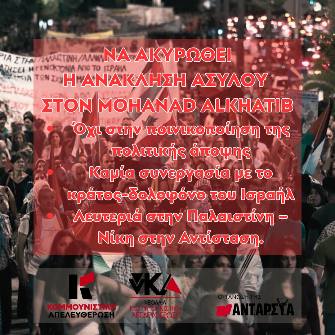 Καμία ανάκληση ασύλου σε κανέναν/καμία πρόσφυγα! Να ακυρωθεί η ανάκληση ασύλου στον Μohanad Αlkhatib. Καμία ποινικοποίηση της πολιτικής άποψης και δράσης! Νίκη στην παλαιστινιακή αντίσταση – λευτεριά στην Παλαιστίνη!