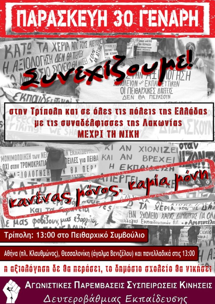 Οι Παρεμβάσεις καλούν και την Παρασκευή 30 Γενάρη στη 1μμ στην Τρίπολη αλλά και στην Αθήνα (Κλαυθμώνος), Θεσσαλονίκη (Άγαλμ Βενιζέλου) και όλες τις πόλεις της χώρας σε συγκεντρώσεις και διαδηλώσεις.