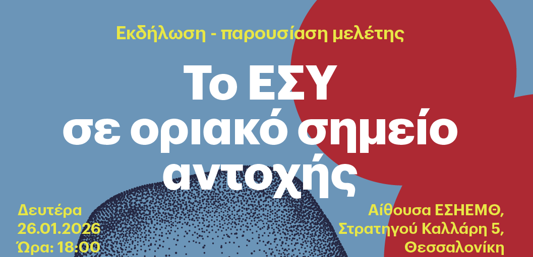 To Κέντρο Έρευνας και Εκπαίδευσης στη Δημόσια Υγεία, την Πολιτική Υγείας και την Πρωτοβάθμια Φροντίδα Υγείας (ΚΕΠΥ) σε συνεργασία με το ETERON – Ινστιτούτο για την Έρευνα και την Κοινωνική Αλλαγή και τη στήριξη της Ένωσης Νοσοκομειακών Ιατρών Θεσσαλονίκης (ΕΝΙΘ) διοργανώνουν εκδήλωση παρουσίαση της νέας μελέτης των ΚΕΠΥ-ΕΤΕΡΟΝ «Το ΕΣΥ σε οριακό σημείο αντοχής: μια διαχρονική αποτίμηση της απόδοσης του στον απόηχο της οικονομικής και πανδημικής κρίσης»