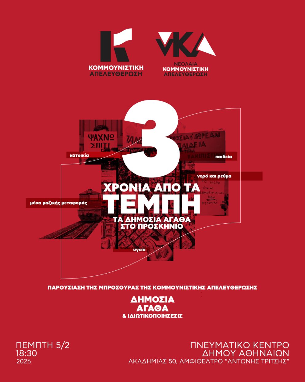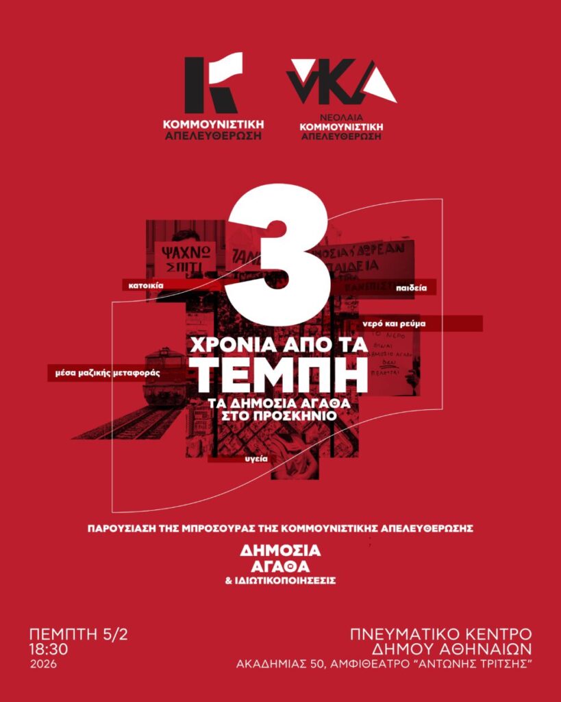 Με αφορμή την τρίτη επέτειο του εγκλήματος των Τεμπών, οι οργανώσεις Κομμουνιστική Απελευθέρωση και νΚΑ διοργανώνουν εκδήλωση την Πέμπτη 5 Φεβρουαρίου, στις 6:30 μ.μ. στο Πνευματικό Κέντρο Δήμου Αθηναίων (είσοδος από την Σόλωνος, δίπλα στη Νομική) για την παρουσίαση της μπροσούρας που έχουν εκδώσει για τα δημόσια αγαθά και τις ιδιωτικοποιήσεις.