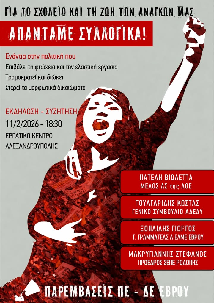 Οι Παρεμβάσεις ΠΕ – ΔΕ Έβρου την Τετάρτη 11/2 στις 18:30, οργανώνουν εκδήλωση στο Εργατικό Κέντρο Αλεξανδρούπολης με θέμα το σχολείο και τη ζωή των αναγκών μας και την απάντηση του κινήματος ενάντια στην πολιτική που επιβάλλει τη φτώχεια και την ελαστική εργασία, τρομοκρατεί και διώκει και στερεί τα μορφωτικά δικαιώματα.