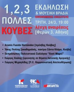 Στις 24/3 θα πραγματοποιηθεί κεντρική εκδήλωση με τίτλο: “Μια, δυο, τρεις, πολλές Κούβες” (19:00, Λέσχη Αναιρέσεις, Φερών 3) και βραδιά οικονομικής ενίσχυσης με κουβανική μουσική.