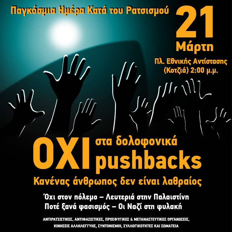 Το Σάββατο 21 Μάρτη, Παγκόσμια μέρα κατά του Ρατσισμού, πρόσφυγες και μετανάστριες, αντιρατσιστικές οργανώσεις και κινήσεις αλληλεγγύης, σωματεία και φοιτητικοί σύλλογοι, τοπικές συλλογικότητες και πρωτοβουλίες αντίστασης, ενώνουν τη φωνή τους ενάντια στις δολοφονικές πολιτικές «αποτροπής» της προσφυγιάς από την κυβέρνηση της ΝΔ και την αντιπροσφυγική πολιτική της ΕΕ.