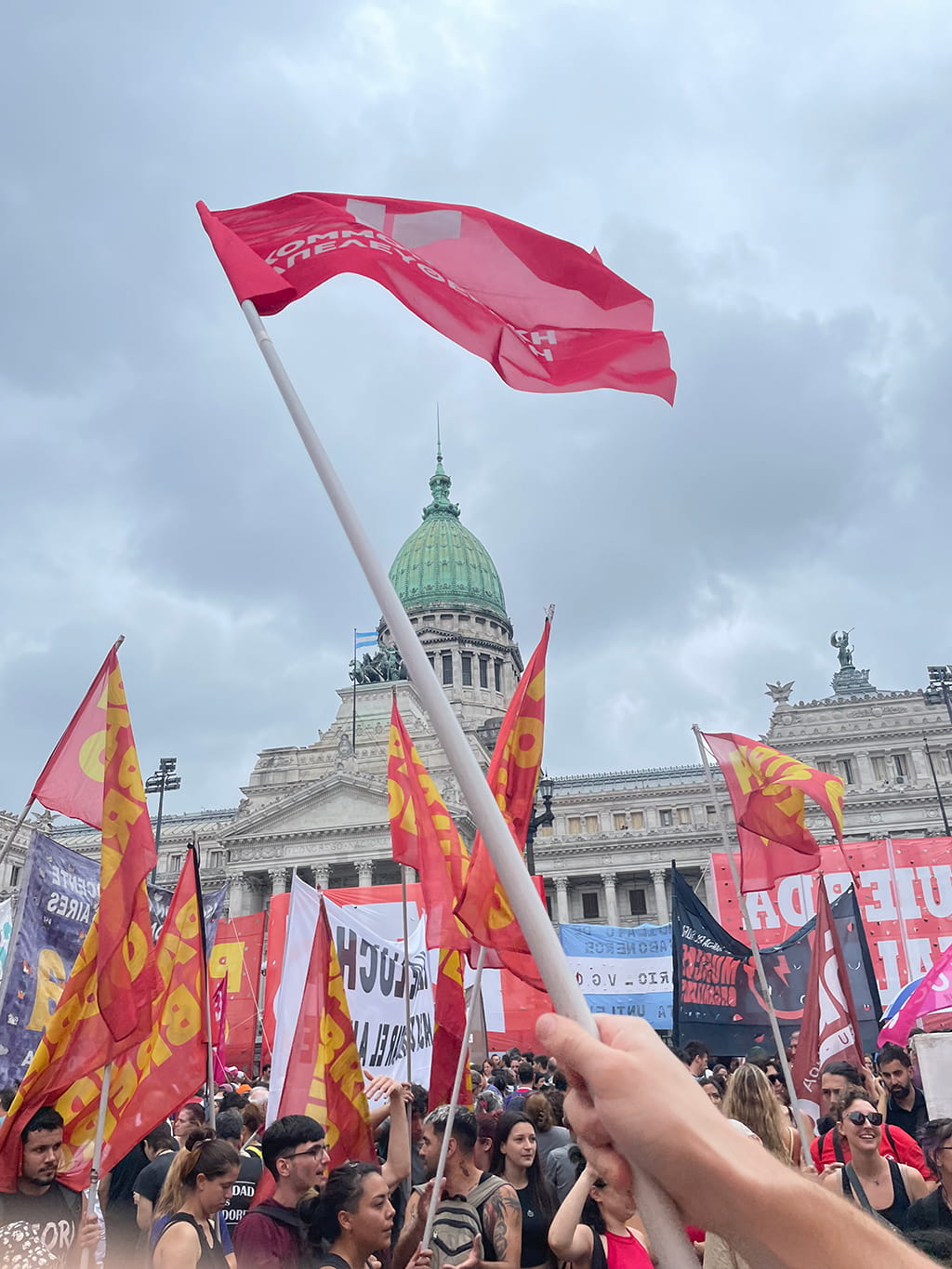 Τις επόμενες μέρες του ταξιδιού μας ήμασταν στο Μπουένος Άιρες, όπου συμμετείχαμε στη μεγάλη συγκέντρωση έξω από το Εθνικό Κογκρέσο, ημέρα γενικής απεργίας, ενάντια στο νομοσχέδιο της κυβέρνησης Μιλέι που επιτρέπει την 12ωρη εργασία. Επίσης, συμμετείχαμε στην απεργιακή περιφρούρηση του εργοστασίου της Fate, στηρίξαμε τον αγώνα του σωματείου SUTNA (Ενιαίο Συνδικάτο Εργαζομένων στα Ελαστικά Αργεντινής) και παρακολουθήσαμε τη συνέλευση του, στην οποία αποφασίστηκε να κλιμακωθεί ο αγώνας και να συνεχιστεί ο απεργιακός αποκλεισμός. Τέλος, κάναμε παρέμβαση στο συνέδριο των δασκάλων της Αργεντινής, στο οποίο μεταφέραμε την κατάσταση στην Ελλάδα και μιλήσαμε για τους αγώνες των δικών μας δασκάλων ενάντια στην αξιολόγηση.