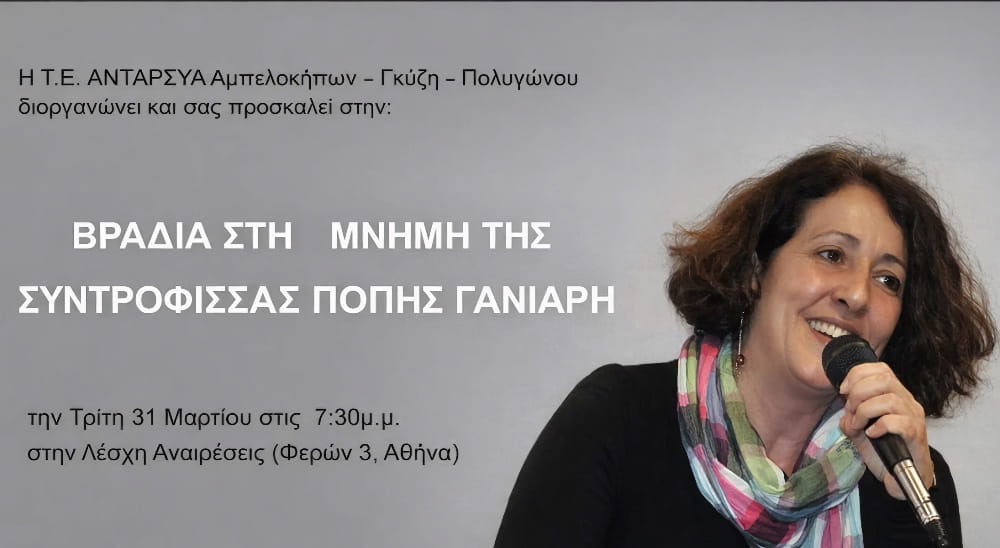 στη μνήμη της συντρόφισσας Πόπης Γανιάρη την Τρίτη 31 Μάρτη 2026 στις 19:30