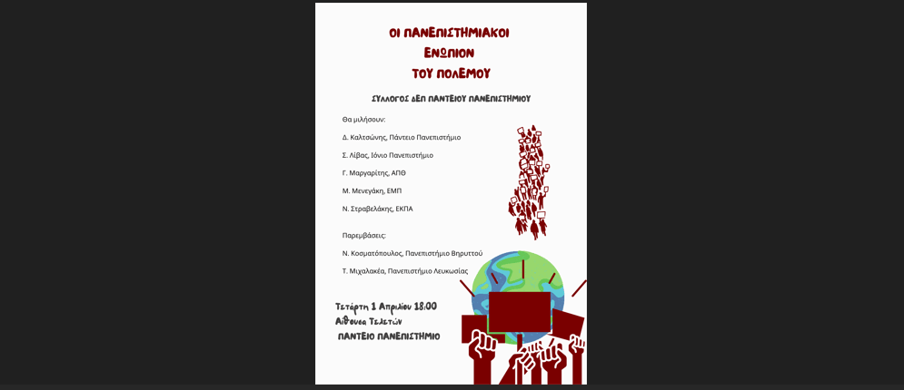 ΕΚΔΗΛΩΣΗ ΣΤΟ ΠΑΝΤΕΙΟ ΓΙΑ ΤΟΝ ΠΟΛΕΜΟ
