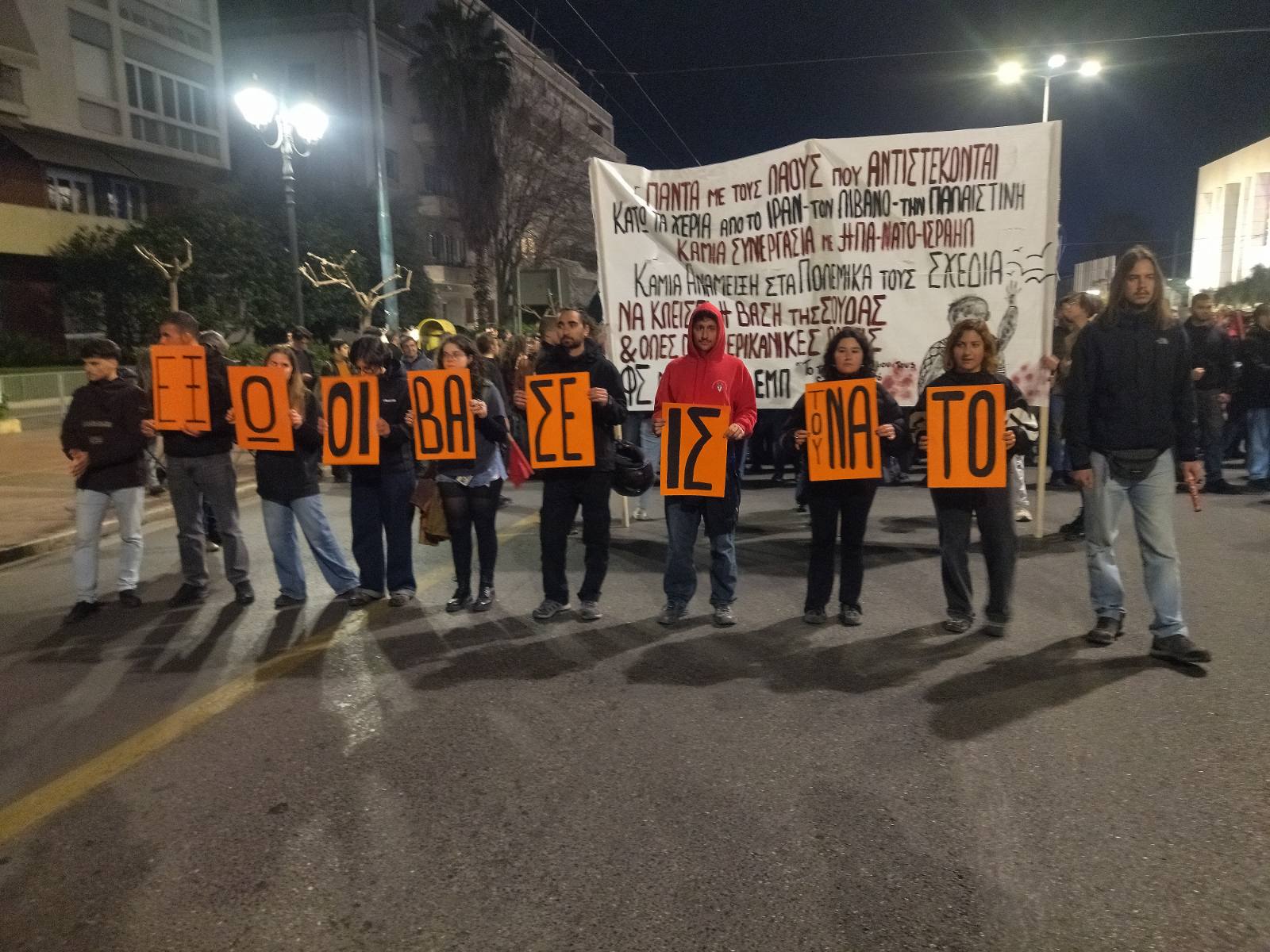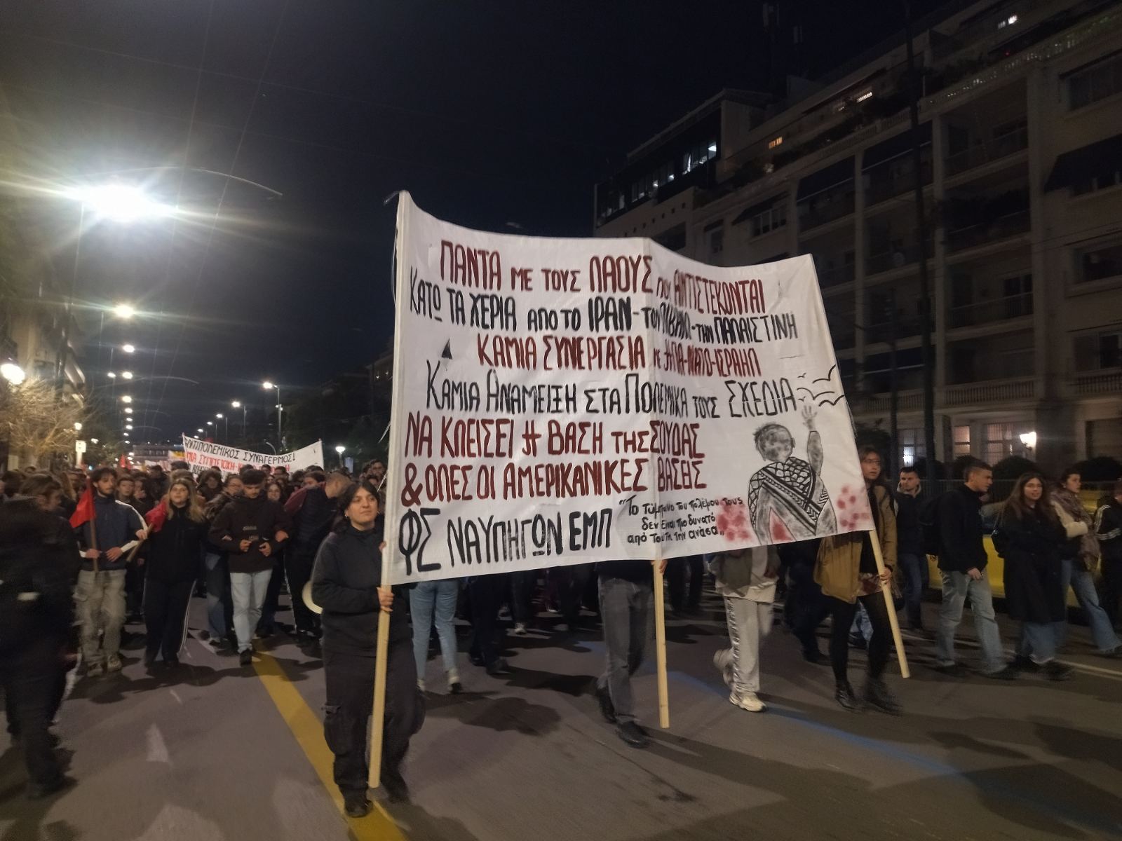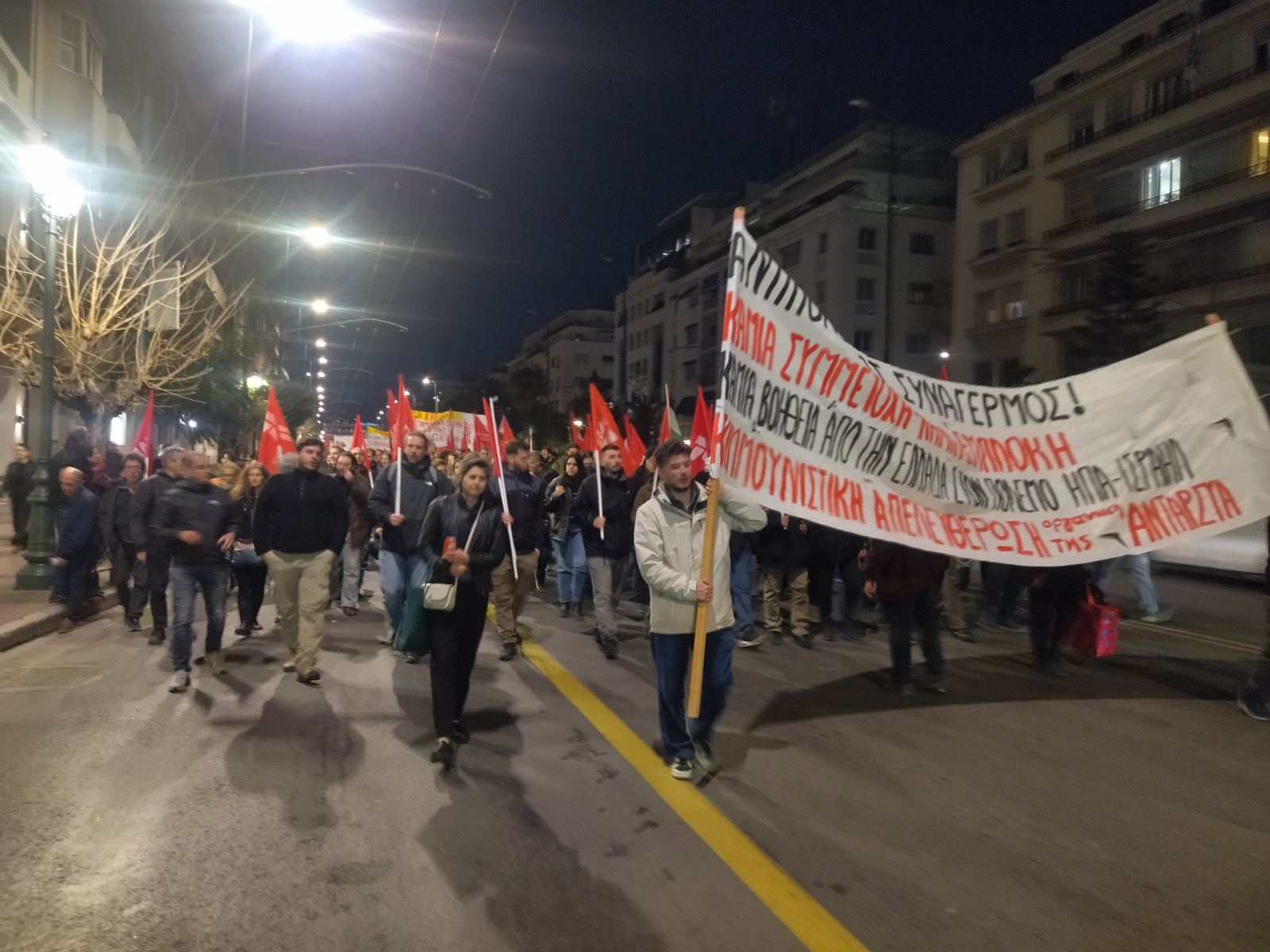 Οι διαδηλωτές και διαδηλώτριες φώναξαν συνθήματα όπως «Η αλληλεγγύη το όπλο των λαών – πόλεμο στον πόλεμο των ιμπεριαλιστών», «έξω το ΝΑΤΟ και οι Αμερικανοί, δικοί τους οι πόλεμοι, δικοί μας οι νεκροί» αλλά και συνθήματα αλληλεγγύης υπέρ της Παλαιστίνης….(Περισσότερα σε λίγο)