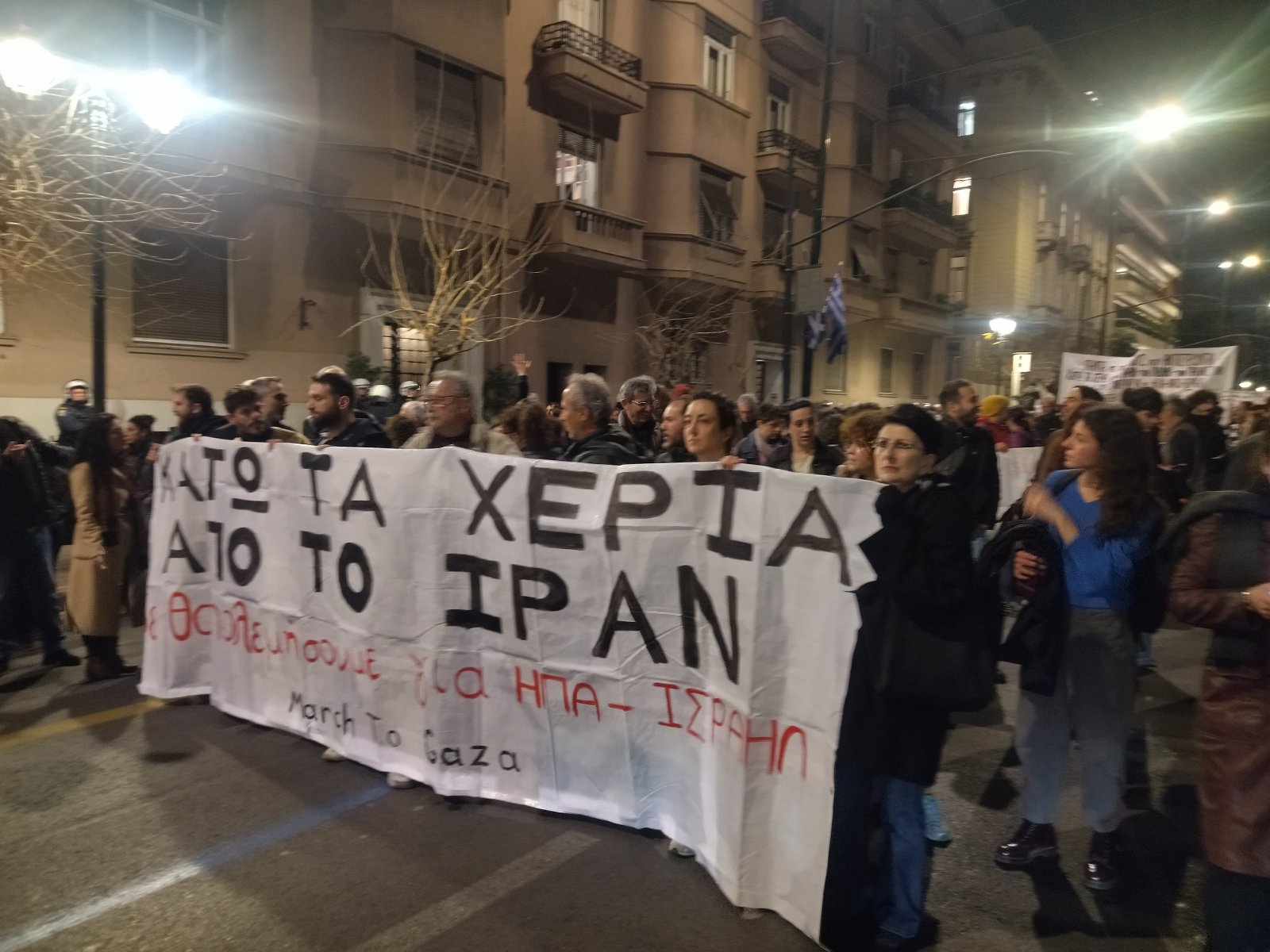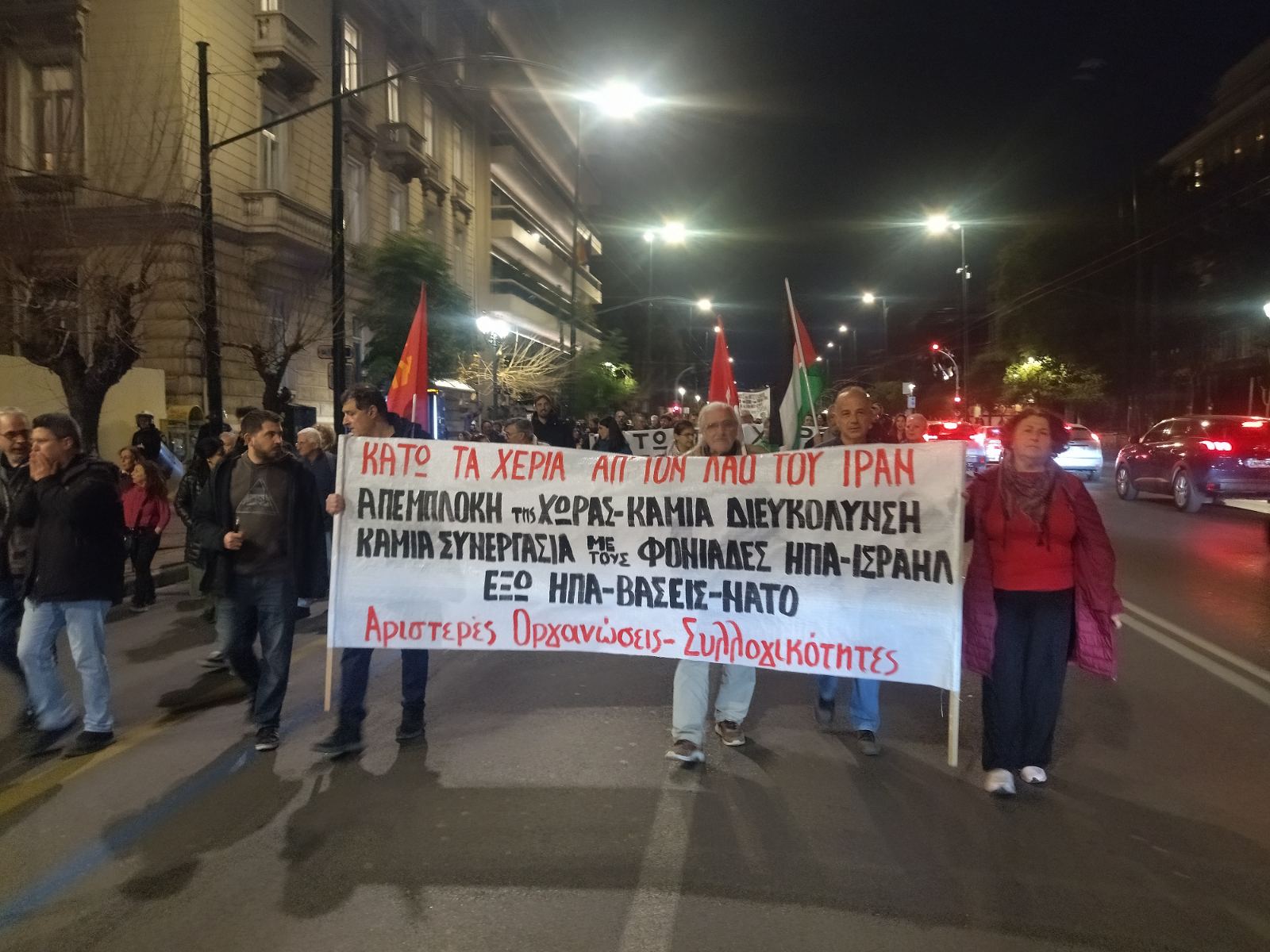 Με μια μεγάλη και μαχητική αντιπολεμική διαδήλωση, που ξεκίνησε από το Σύνταγμα και κατέληξε στην αμερικανική πρεσβεία, απάντησαν σήμερα το απόγευμα σωματεία, φοιτητικοί σύλλογοι και πολιτικές οργανώσεις στον νέο πόλεμο που εξαπολύουν οι ΗΠΑ και το Ισραήλ εναντίον του Ιράν και του Λιβάνου. Οι διαδηλωτές κατήγγειλαν ταυτόχρονα την επικίνδυνη εμπλοκή της ελληνικής κυβέρνησης, η οποία έχει αποστείλει φρεγάτες και αεροσκάφη για τη φύλαξη των βρετανικών βάσεων στην Κύπρο, μετατρέποντας τη χώρα σε μέρος των πολεμικών σχεδιασμών. Στην οργάνωση καλούσαν αριστερές οργανώσεις και συλλογικότητες με στόχο η διαδήλωση να αποτελέσει το πρώτο βήμα ενός ευρύτερου αντιπολεμικού συντονισμού.