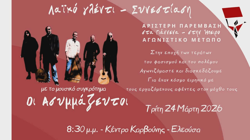 Σήμερα, Τρίτη 24 Μάρτη στις 20:30, η Αριστερή Παρέμβαση στην Ήπειρο και η Αριστερή Παρέμβαση στα Γιάννενα συνδιοργανώνουν Λαϊκό Γλέντι και Συνεστίαση στο Κέντρο Καρβούνης στην Ελεούσα Ιωαννίνων με το μουσικό συγκρότημα Οι Ασυμμάζευτοι.