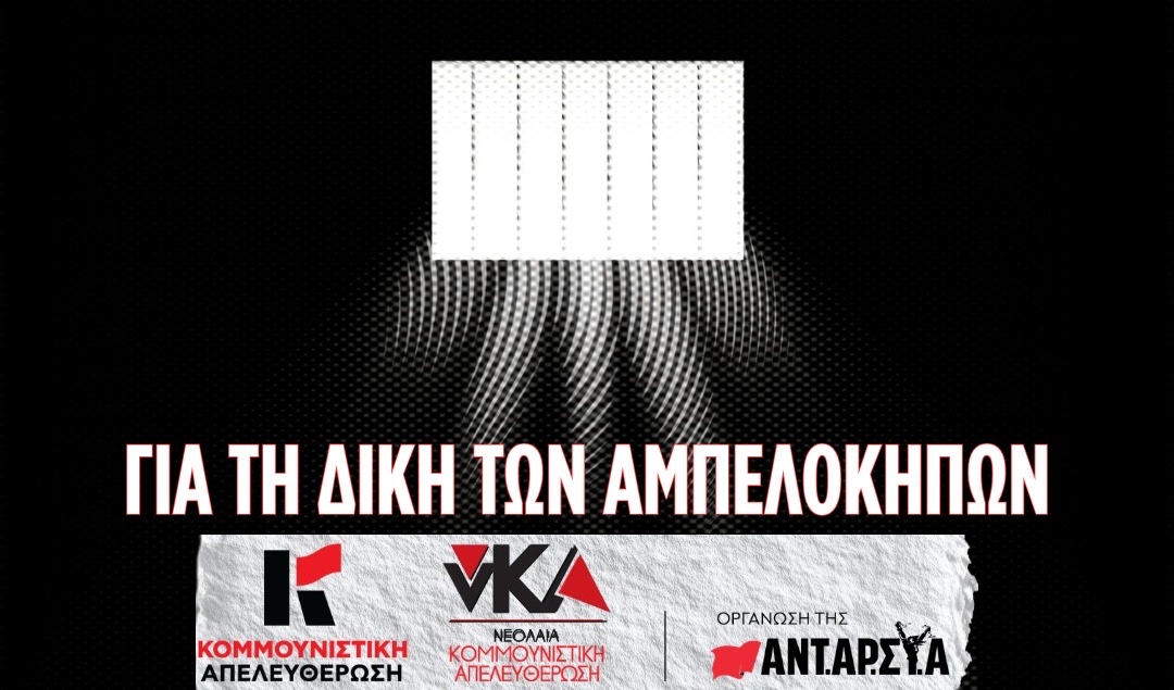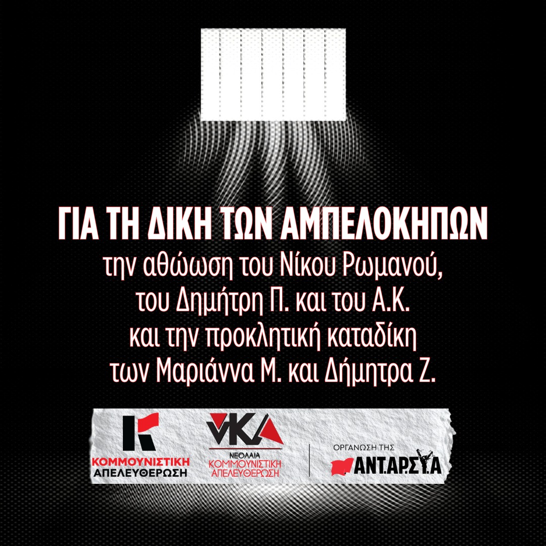 Ανακοίνωση της Κομμουνιστικής Απελευθέρωσης για τη Δίκη των Αμπελοκήπων, την αθώωση του Νίκου Ρωμανού, του Δημήτρη Π. και του Α.Κ. και την προκλητική καταδίκη των Μαριάννα Μ. και Δήμητρα Ζ.